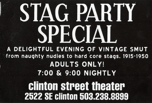 stagatclinton02The liberal 1960s changed the perception of filmed pornography. Times were chaotic and older guys didn’t want to watch females resembling their daughters on-screen when the neighborhood boy’s night out surreptitiously held a stag film showing. Generally, older women (assumed prostitutes) appeared in those black and white clips performing with males who often wore their socks.