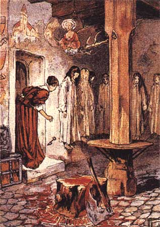 All seems lost though the lass does have a chance. She entreats her sister to keep watch for their brothers who are due to arrive at any moment. Desperation sets in as the final hour creeps closer and closer. But good fortune intervenes. The brothers break in just as Bluebeard is “ready to cut off her head.”