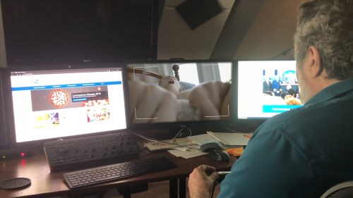 The viewer learns early that Dr. Connor’s personal life is a ready target for government programming. From her apartment, she has her own cam girl show complete with dancing pole (she goes by the name, “Covert Covid”) and a boyfriend with whom she shares her sexual energy. Early in the film we discover that the guy is quarantined. With her computer, Sara checks in with him to break his erotic loneliness. Using a speculum to give him an “up close and personal” view of her offerings, she masturbates to orgasm. We assume he does likewise. That’s love in the covid age, you see.