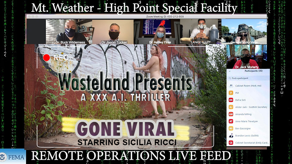 “We’ll be watching you!” a researcher for the CIA Psychomotor Enhancement Training Facility tells Dr. Sara Connor, the central character of Colin Rowntree’s latest film, Going Viral: A XXX COVID A.I Thriller. Indeed, the panel of scientists has been surreptitiously peeking at her sexual escapades with the intent of using government programming to transition the shapely doctor into a sex android who will do their bidding, or investigating, if you will.