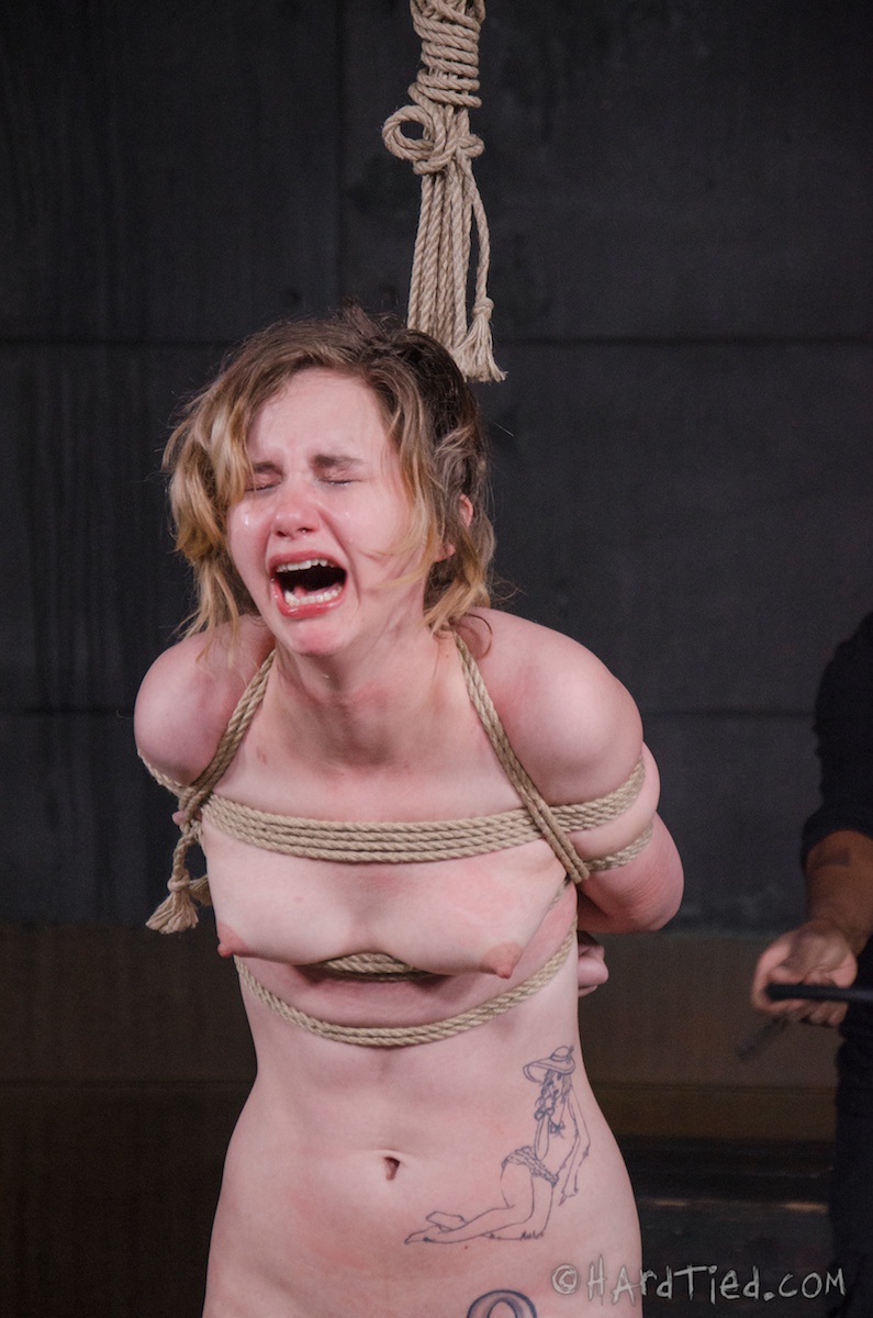 She is suspended in a chest harness, dangling from the ceiling on tiptoe, giving her wiggle room to highlight her fear, but disallowing escape.