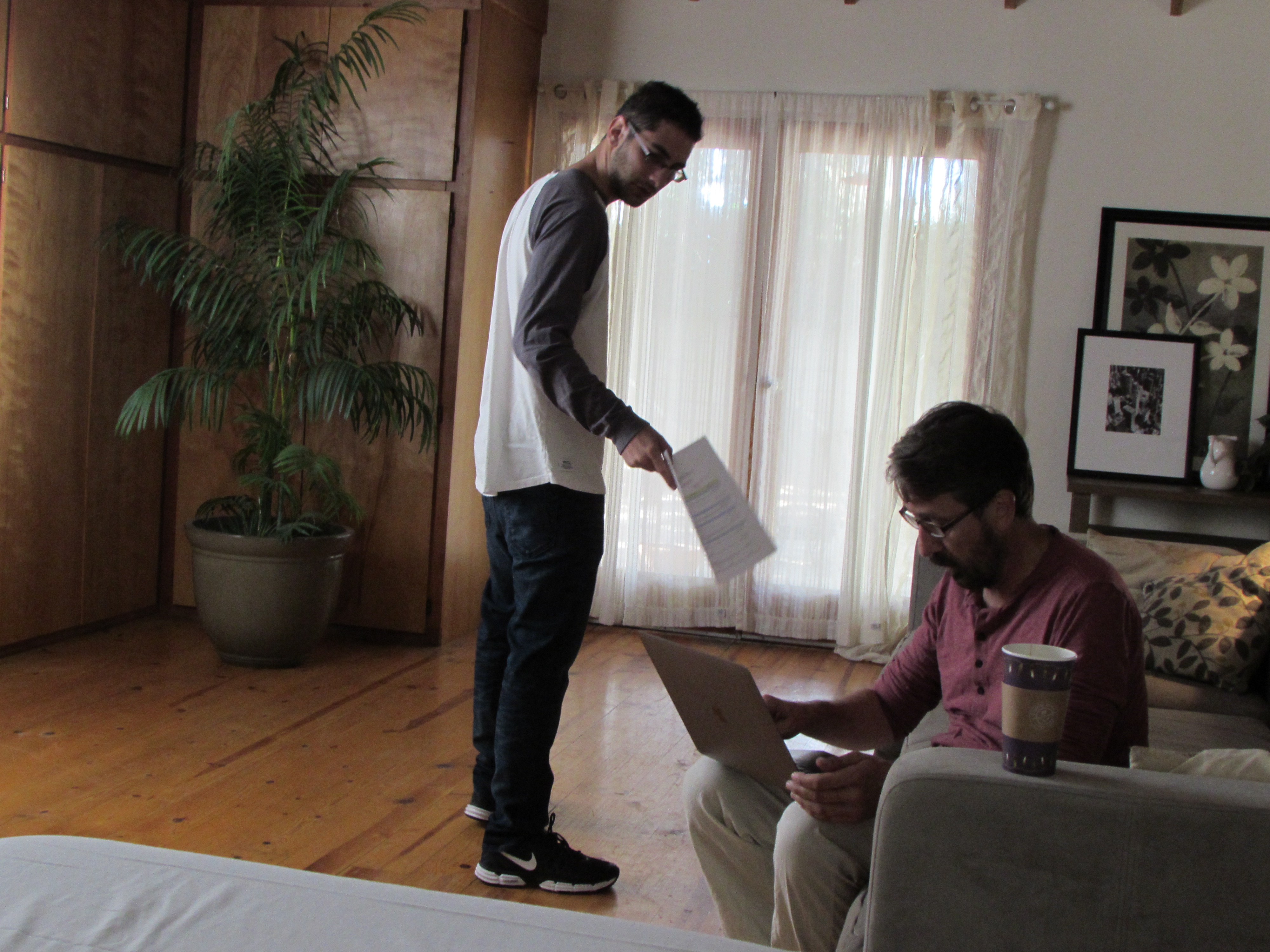 Eddie and AJ are setting up a tripod on a dolly constructed of two long pipes so the camera can glide through the opening sequence.