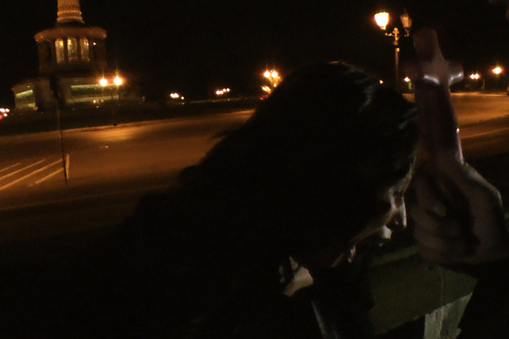 A satanic guttural voice over is heard. Manuel puts a glass tube shaped like a dildo into Amira’s anus through which holy water will be poured.