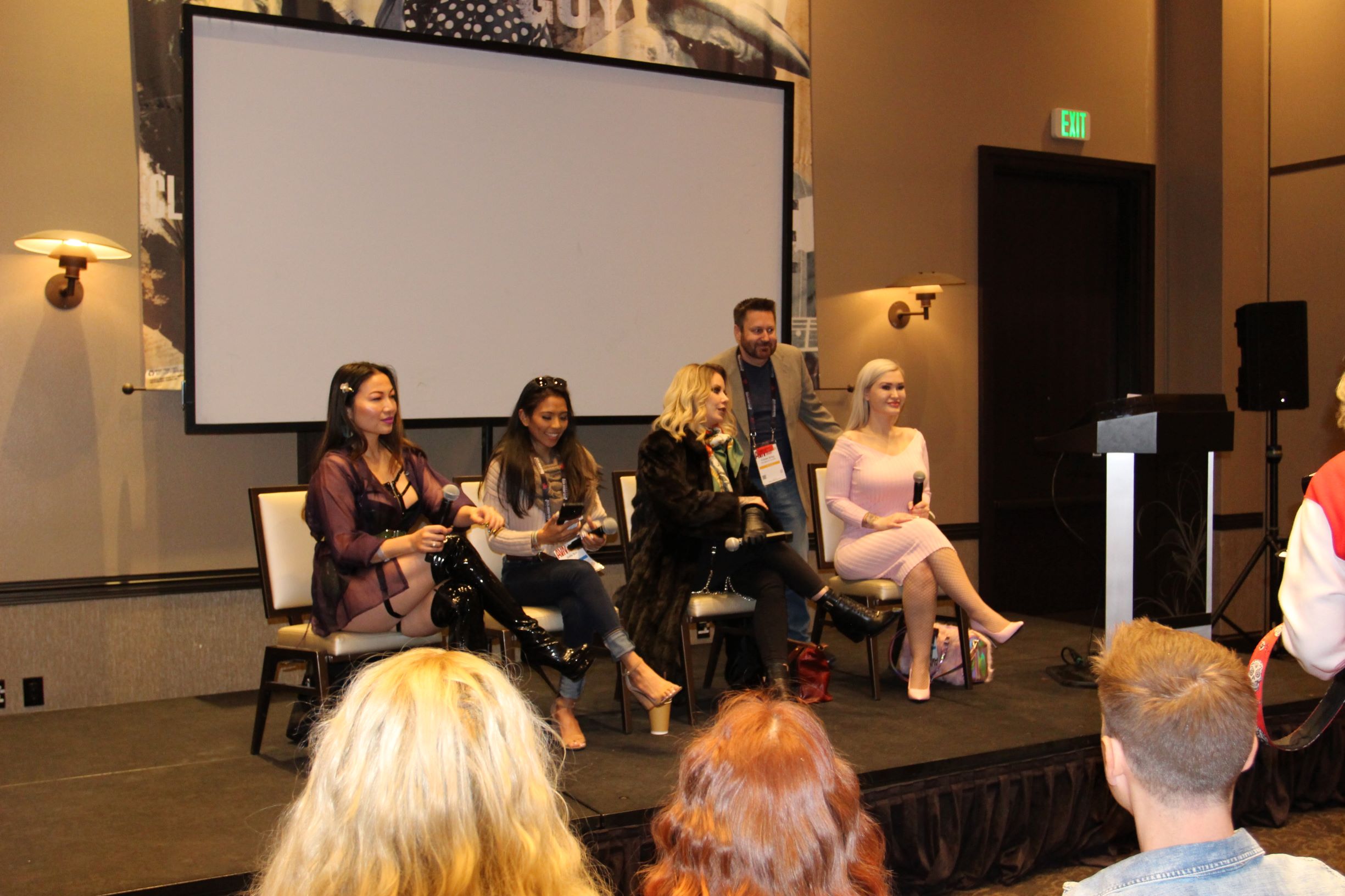 The panelists were Mz. Kim, a domme who teaches classes on market strategies and owning content; Asian performer Jada Kai; Madelyn Marlowe, whose industry footprint was branded by Kink.com; and Violet Doll, online dominatrix and industry veteran.